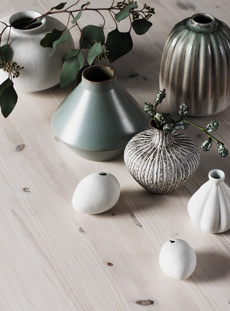 01. Vase en céramique | 02. Vase cactus blanc | 03. Miroir suspendu à corde | 04. Pouf en lin gris
